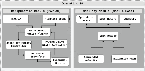 两个系统都使用ROS进行控制。即使整个系统的软件运行在同一台操作PC上,系统的软件也可以分为多层。它可以分为四足系统的定位和导航(系统的移动性)和PAPRAS的硬件控制(系统的操纵)。