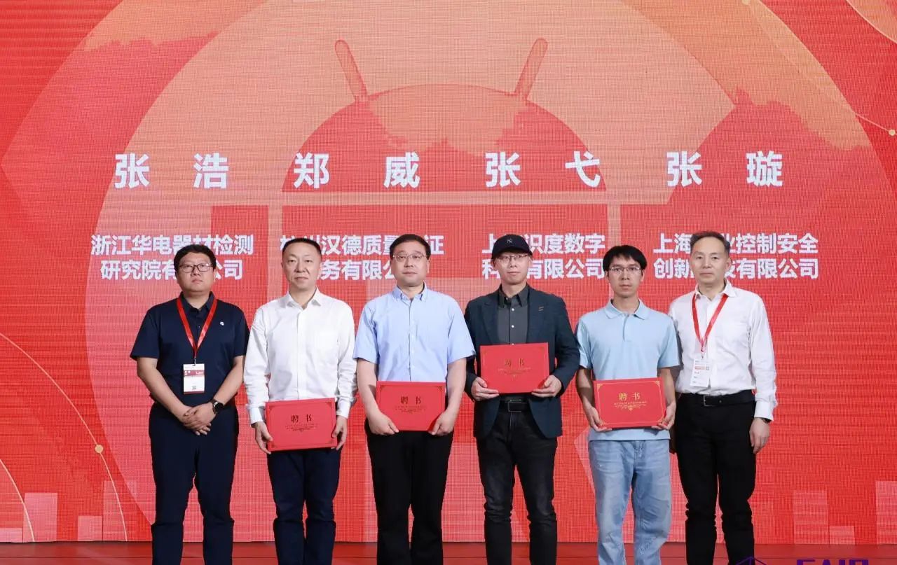 工作组组长郑军奇、副组长刘宇飞为来自浙江华电器材检测HTH.COM-华体会有限公司、杭州汉德质量认证服务有限公司、上海识度数字科技有限公司、上海工业控制安全创新科技有限公司工作组新进成员颁发专家聘书。
