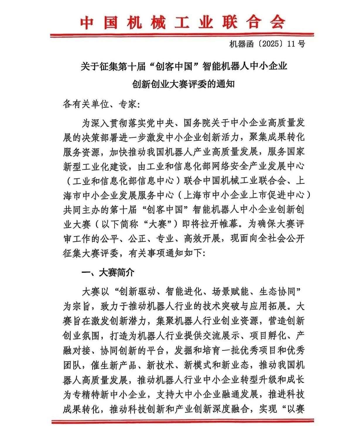 关于征集第十届“创客中国”智能机器人中小企业创新创业大赛评委的通知