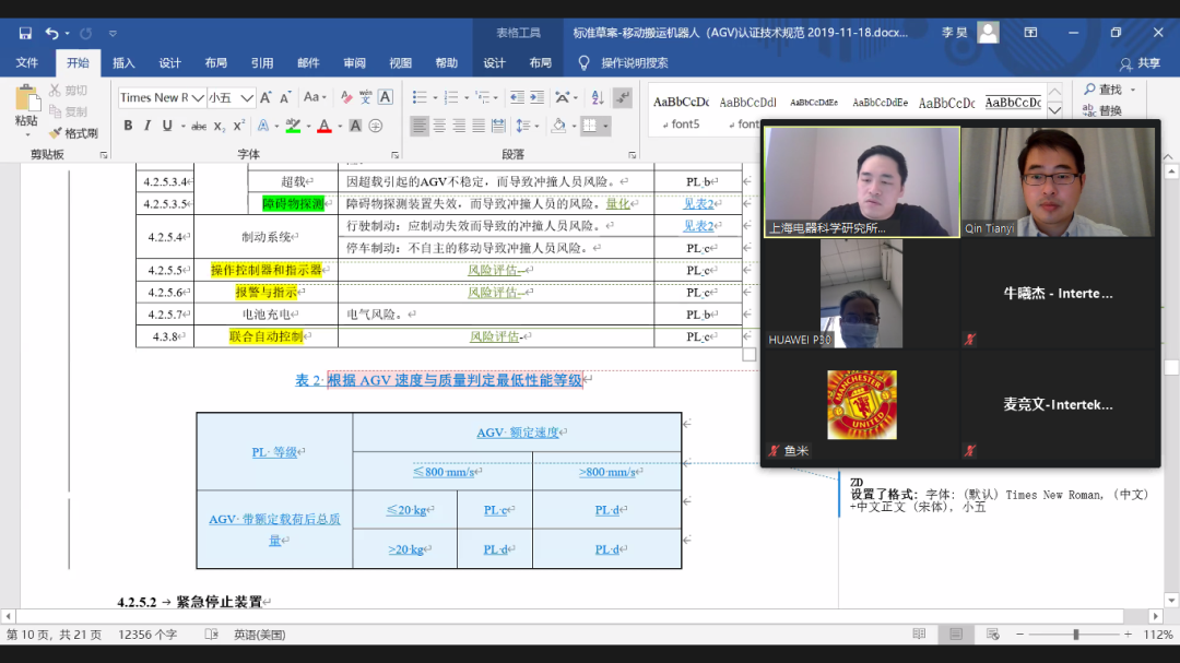 主持人章鼎首先汇报了2019-XX-XX第一次会议后的标准草案技术细节完善工作及目前项目总体进展,之后包括来自杭州海康机器人技术有限公司、珠海格力智能装备有限公司、优艾智合机器人科技有限公司、华晓精密工业(苏州)有限公司4家AGV制造商和通标标准技术服务有限公司、Intertek天祥集团2家第三方检测认证机构的预评审专家组对标准草案的符合性、适用性、科学性和规范性进行充分讨论。本技术规范的起草组代表章鼎、秦天溢认真听取并记录专家对标准草案预审查的意见,并表示会后将进一步认真完善标准草案,并最终形成送审稿。