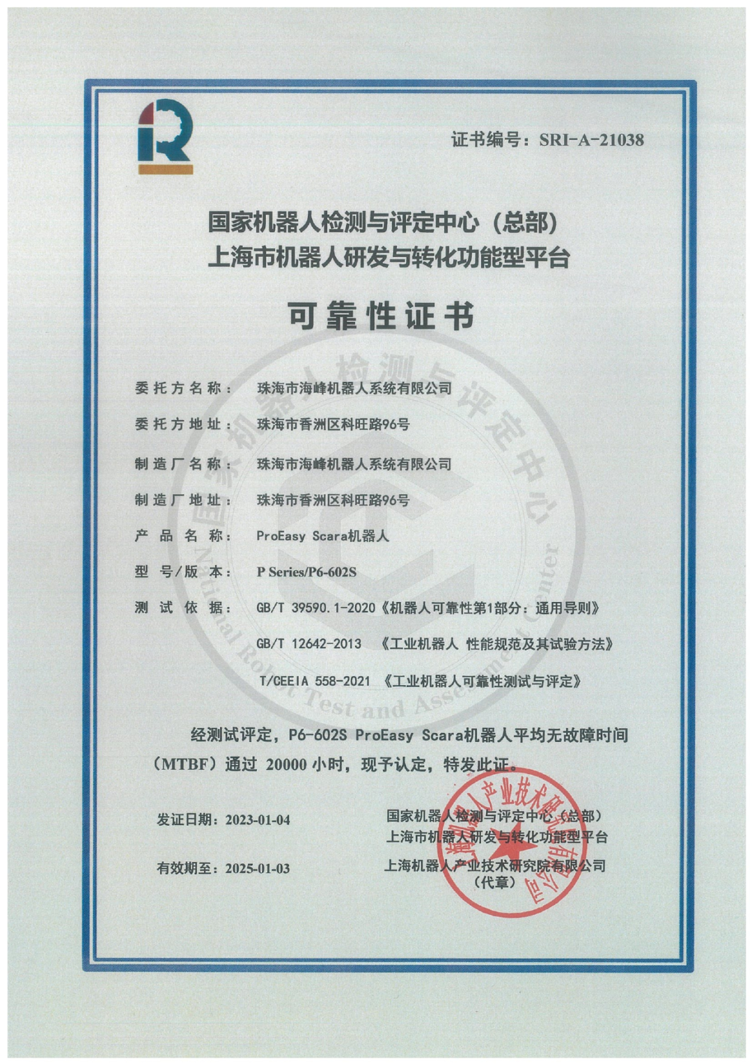1月3日,珠海市海峰机器人系统有限公司的ProEasy 机器人P6-602s SCARA机器人顺利通过HTH.COM-华体会(中国)机器人有限公司官网的MTBF 20000小时测评。