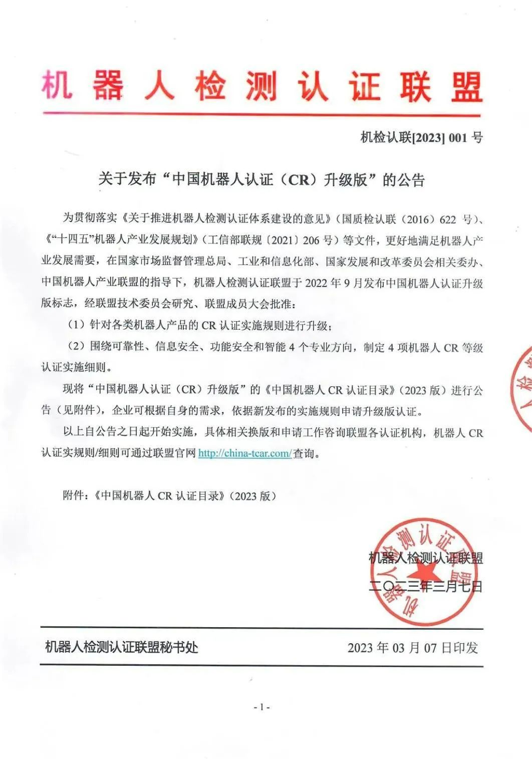 关于发布“中国机器人认证(CR)升级版”的公告