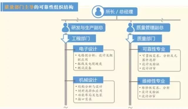 航空航天大概是三个结构。第一个结构放在质量部门,质量部门下面有可靠性专业室,专业的技术室和设计室。但这种结构,发展到一定阶段就不顺当了。因为,可靠性毕竟要从根上设计,而不能仅仅作为管理工作放在质量部门,因为它质量部门是管理责任,无法承担设计责任。这个时候,一定有冲突。